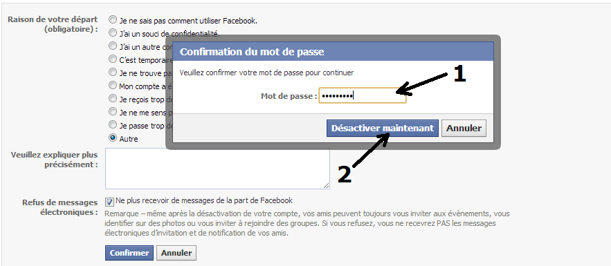 4. Désignez la raison de votre départ, n'oubliez pas de cocher la case (n°2) puis cliquez sur "Confirmer".