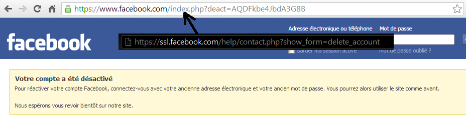 6. Vous arrivez sur une page qui vous annonce que votre compte a été désactivé, restez sur cette page et entrez dans la barre d'adresse =